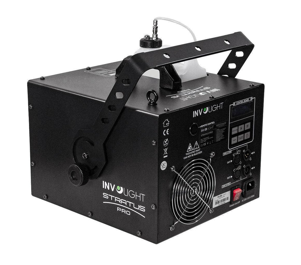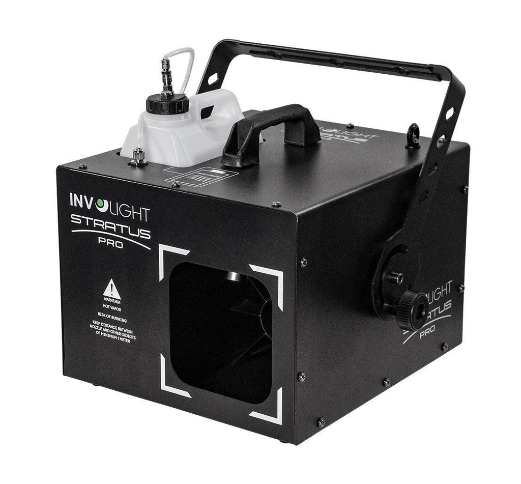 Der INVOLIGHT "STRATUS PRO" ist ein professioneller Hazer mit DMX Ansteuerung, einem Fluidsensor und Selbstreinigungsfunktion! Der Nebel wird nicht in dichten Wolken ausgestoßen, sondern dezent im Raum verteilt! Aufgrund des besonders sparsamen Verbrauchs (7ml/min.) ist die Maschine enorm kostengünstig zu betreiben! Besonders hervorzuheben ist die Tatsache, dass der "STRATUS PRO kein klassisches Heizelement verwendet. Die nötige Temperatur wird durch eine Art Heizkabel erreicht, das die Fluidzuleitung erhitzt. Diese Technik ist besonders sicher und zuverlässig. Die Ausstoßrichtung kann über eine verstellbare Klappe vorne reguliert werden. Die im Gerät integrierte Kontrolleinheit ermöglicht vielfältige Einstellungen wie eine Adressierung für die 2-Kanal DMX-Steuerung, manueller Ausstoß, Dauerausstoß und einstellbare Intervallschaltungen mit ebenfalls einstellbarer Ausstoß-Dauer und Ausstoß-Stärke. Als besonders innovatives Ausstattungsmerkmal verfügt der "STRATUS PRO" über einen Fluidsensor. Dieser erkennt einen zu niedrigen Füllstand im Tank und schaltet die Pumpe ab, damit sie nicht trocken läuft.